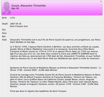 - Alexandre-Thimothée Garand (1725-1807) fut le parrain de Pierre Boulé, fils de Jean Boulé et de Marie Magdeleine Terrien, baptisé le 19 janvier 1763 à Saint-François-de-la-Rivière-du-Sud