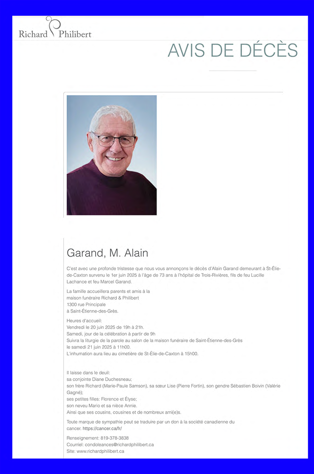 Avis de décès de Alain Garand (vers 1952-2025) :