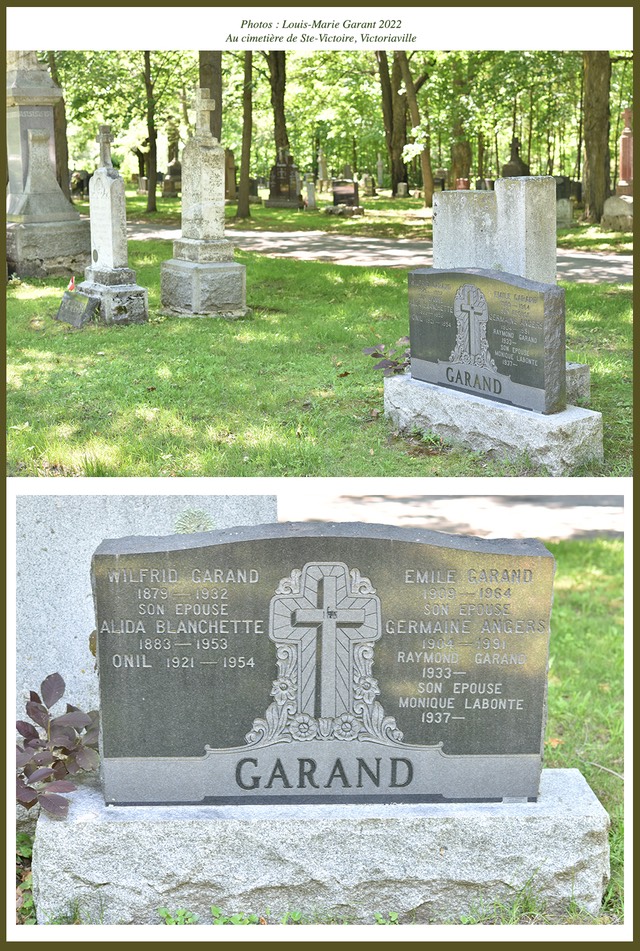 - Garand Raymond (1933-2023), né le 31 mai 1933, baptisé le même jour à Victoriaville, paroisse Ste-Victoire. Le registre nous confirme que le nom complet au baptême était Joseph André Raymond Garand, qu’il est bien le fils de Emile Garand et de Germaine Angers de Victoriaville. Le parrain fut Joseph Angers et la marraine Euphémie Luneau. Le baptême fut célébré par l’abbé Auguste Beauchesne. Euphémie Luneau, Joseph Angers et Emile Garnd signèrent le registre du baptême. Selon l’avis de décès de son frère Marcel, il épousa Monique Labonté