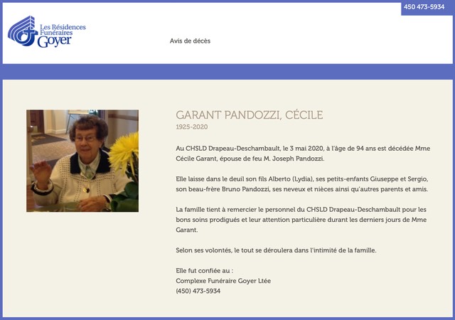 - Année et lieu du décès: décédée le 3 mai 2020 à l’âge de 94 ans