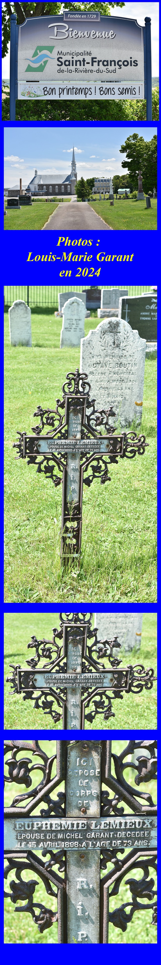 - Épouse: Lemieux Euphémie (1826-1898) Le mariage a lieu le 30 juin 1846 à Saint-François-de-la-Rivière-du-Sud. Le registre du mariage nous confirme que Michel Garant est le fils mineur de Basile Garant et de Geneviève Pelchat de Saint-François, que Euphémie Lemieux, aussi domiciliée à Saint-François est la fille mineure de Jacques Lemieux et de défunte Marie-Louise Carbonneau, aussi de Saint-François. Étaient présents au mariage Olivier Bernard, beau-frère de l’époux, Romain Martineau, ami de l’époux, Jacques Lemieux, père de l’épouse et Laurent Boivin, ami de l’épouse. Le mariage fut célébré par l’abbé Louis-Léon Bélisle, curé de Saint-François de 1840 à 1864. Euphémie Lemieux est née le 4 avril 1826 à Berthier sur Mer, Bellechasse, nous avons trouvé son acte de naissance signé par le curé Joseph-Étienne Cécile, curé de Berthier en 1820, desservant à Saint-Pierre en 1827 et curé de Saint-François-de-la-Rivière-du-Sud à compté du 15 août 1835. Euphémie Lemieux apparaît sur le recensement de 1851. Euphémie est inhumée à Saint-François-de-la-Rivière-du-Sud le 17 avril 1898, elle était décédée le vendredi avant le 13 avril à l’âge de soixante treize ans. Stanislas Boulet et Louis Garant étaient présents aux funérailles présidées par Louis-Alfred Boissinot, curé de Saint-François-de-la-Rivière-du-Sud en 1898 et 1899
