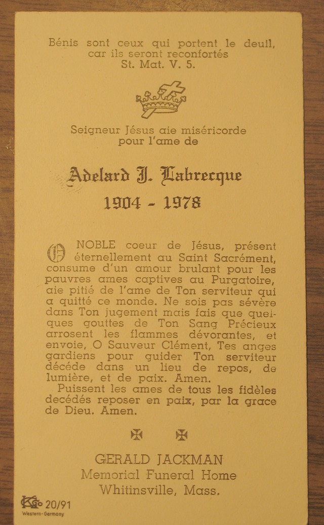 Avis de décès de Joseph Adélard Labrecque (1904-1978) :